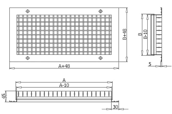 Наружные решетки используются для подачи и удаления воздуха в приточно-вытяжной вентиляции, предназначены для монтажа в воздуховоды или строительные проёмы помещений различных назначений. Решетки представляют собой прямоугольную раму с установленными в нее неподвижными жалюзи, которые препятствуют проникновению атмосферных осадков с улицы. Решетки изготавливаются из алюминиевого профиля и окрашиваются порошковой полиэфирной краской. Стандартный цвет — белый RAL9016. Также возможно окрашивание в любой цвет согласно каталогу RAL. Решетки монтируются с помощью винтового соединения (монтажные отверстия расположены на лицевой стороне рамки), что обеспечивает простоту и надежность монтажа. Решетки изготавливаются как стандартных типоразмеров, так и по заказу. Могут комплектоваться адаптером для бокового или осевого присоединения к воздуховоду круглого и прямоугольного сечения.